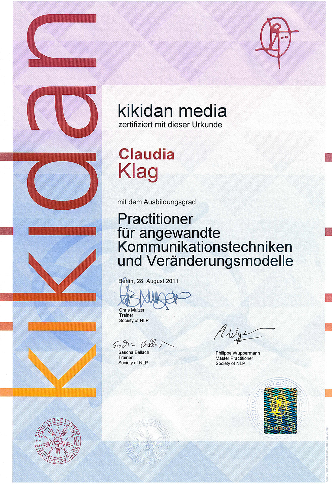 - Practitioner für angewandte Kommunikationstechniken und Veränderungsmodelle – Ausbildung und Zertifizierung durch Kididan Multimedia