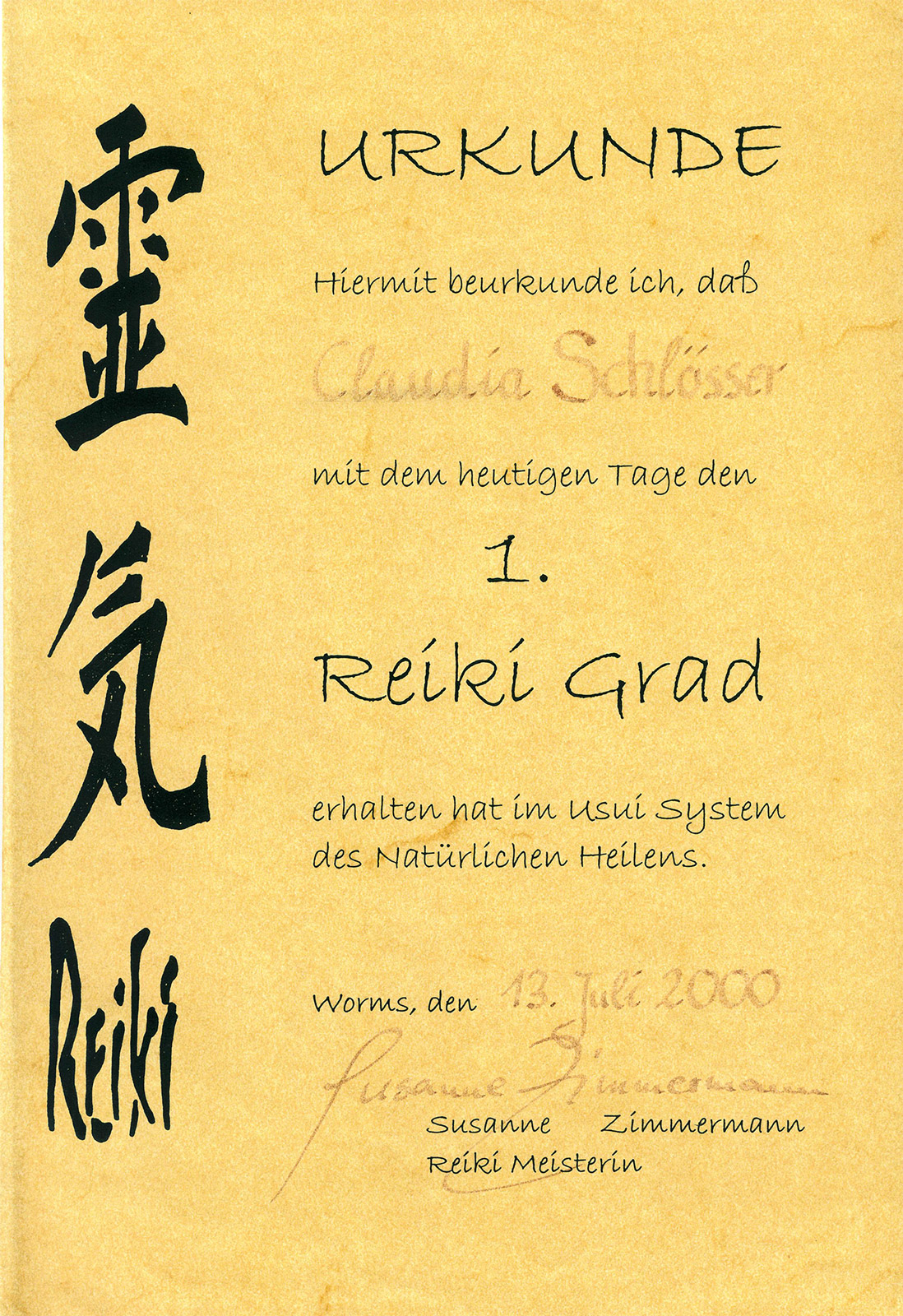 - Reiki –I. Grad im Usui System des natürlichen Heilens – Ausbildung u. Zertifizierung durch Susanna Zimmermann