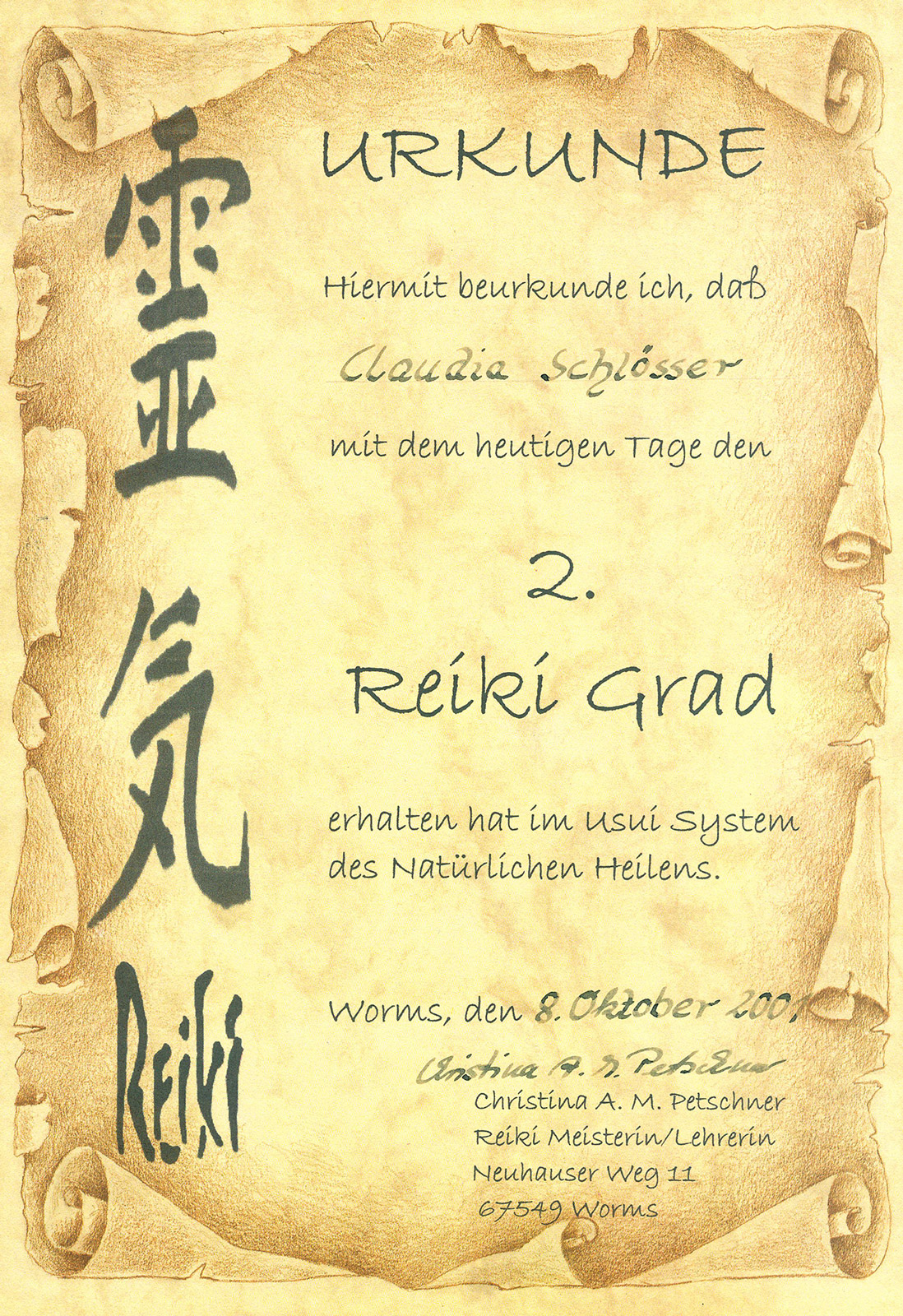 - Reiki – II. Grad im Usui System des natürlichen Heilens – Ausbildung u. Zertifizierung durch Christina Petschner