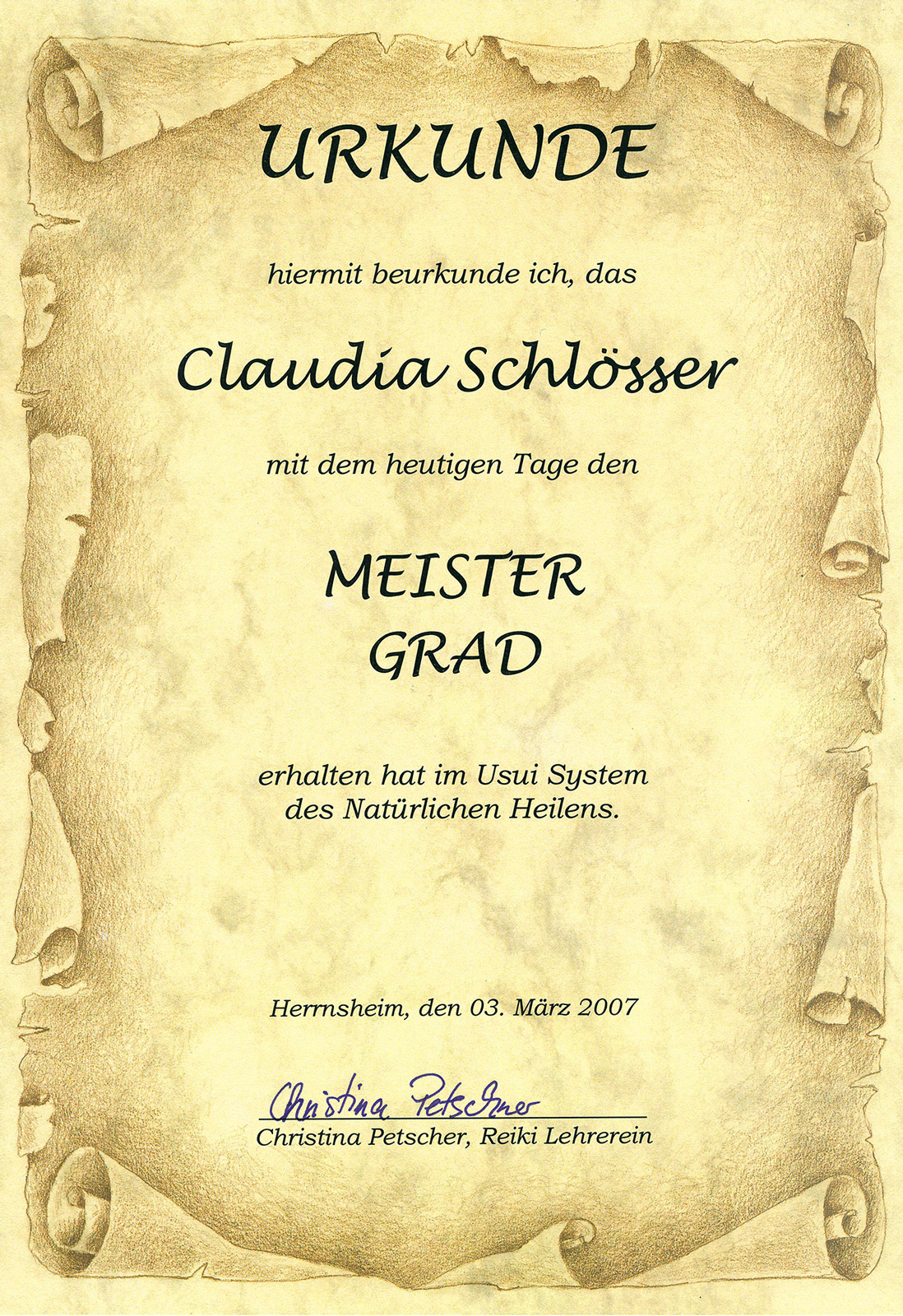 - Reiki – Meistergrad im Usui System des natürlichen Heilens – Ausbildung u. Zertifizierung durch Christina Petschner